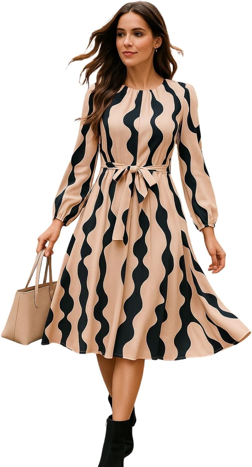 Leriya Fashion Women’s A-Line Midi Dress | Long Sleeve Belted Fit and Flare Gown | Elegant Printed Casual Outfit