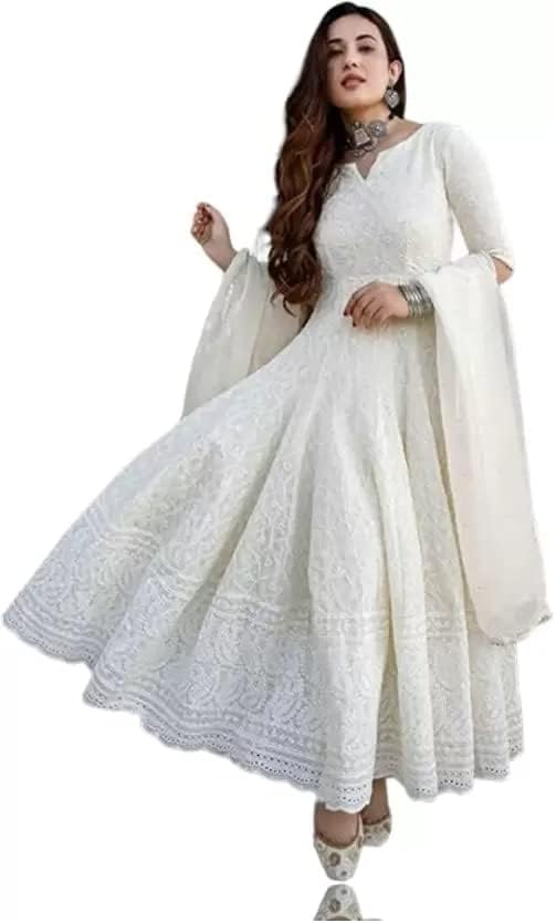Royal Export Women’s Cotton Blend White Chikankari Anarkali Gown with Dupatta | Dresses for Girls | Pant Not Included ||